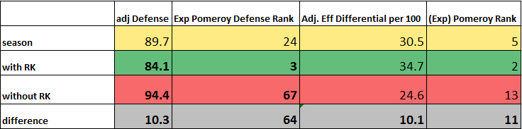 So despite Kelly's immense impact on offense, we can tell that at least Duke's defense looks better with him on the floor. Sixty-four places better.